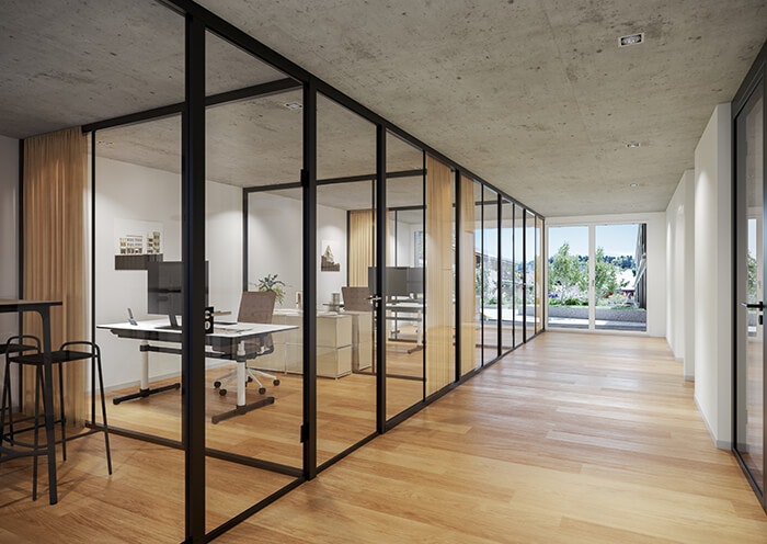 Der Innenausbau zeichnet sich aus durch ein gradliniges Design und hochwertige Materialien. Die Grundrisse sind sehr effizient und ermöglichen eine optimale Raumausnutzung. Deckenhohe Türrahmen aus Massivholz, 2.47m Raumhöhe und fast durchgehend raumhohe Fenster sorgen für ein lichtdurchflutetes Ambiente, was den grosszügigen Eindruck der Wohnung unterstreicht.